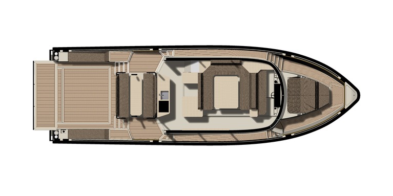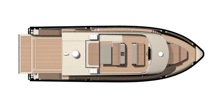 Practical and robust deck plan with synthetic teak, hardtop cockpit and broad walkarounds. Electric BBQ, Fusion audio, hydraulic platform and dual Delta anchors enhance functionality for cruising and swimming.