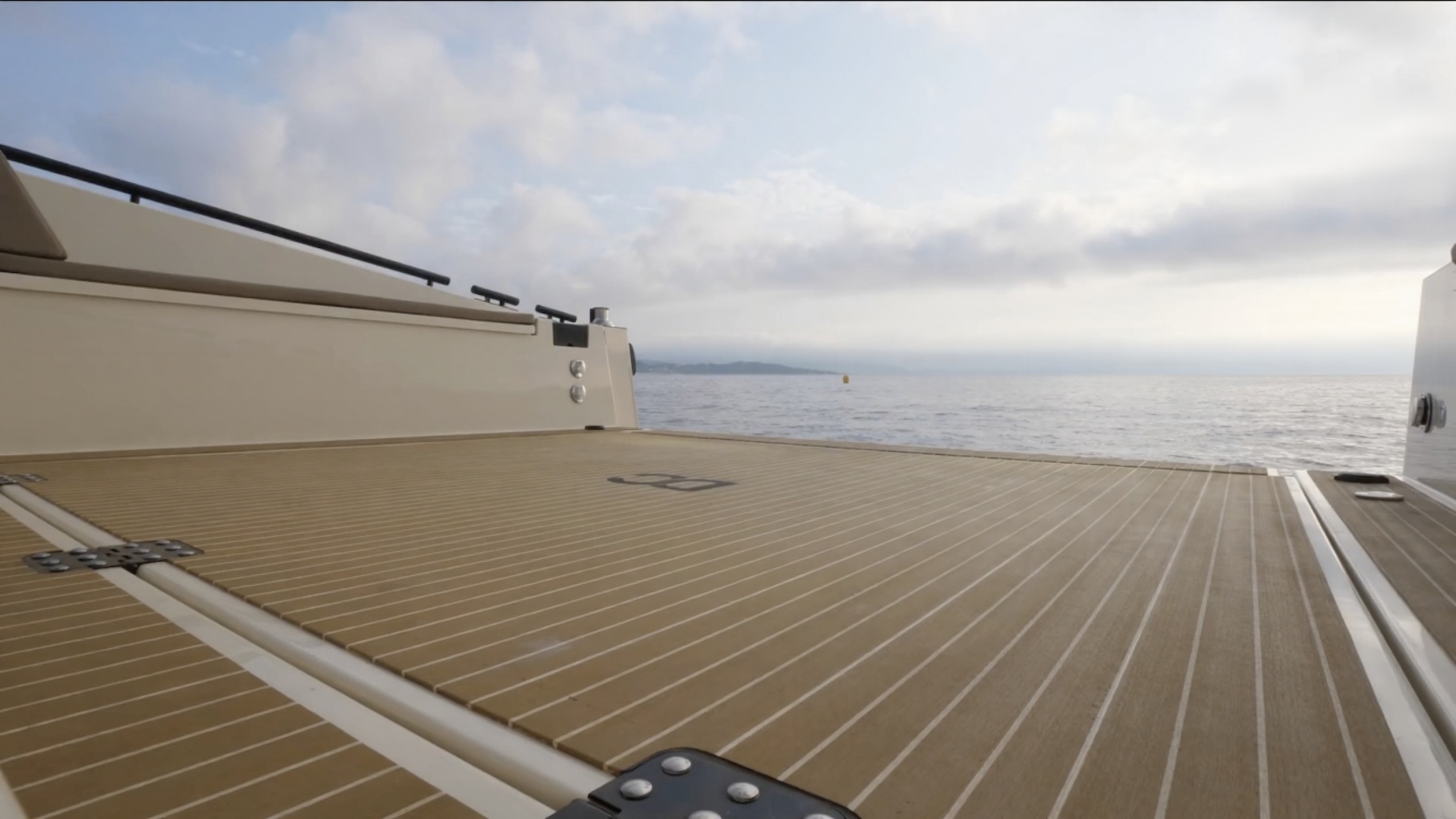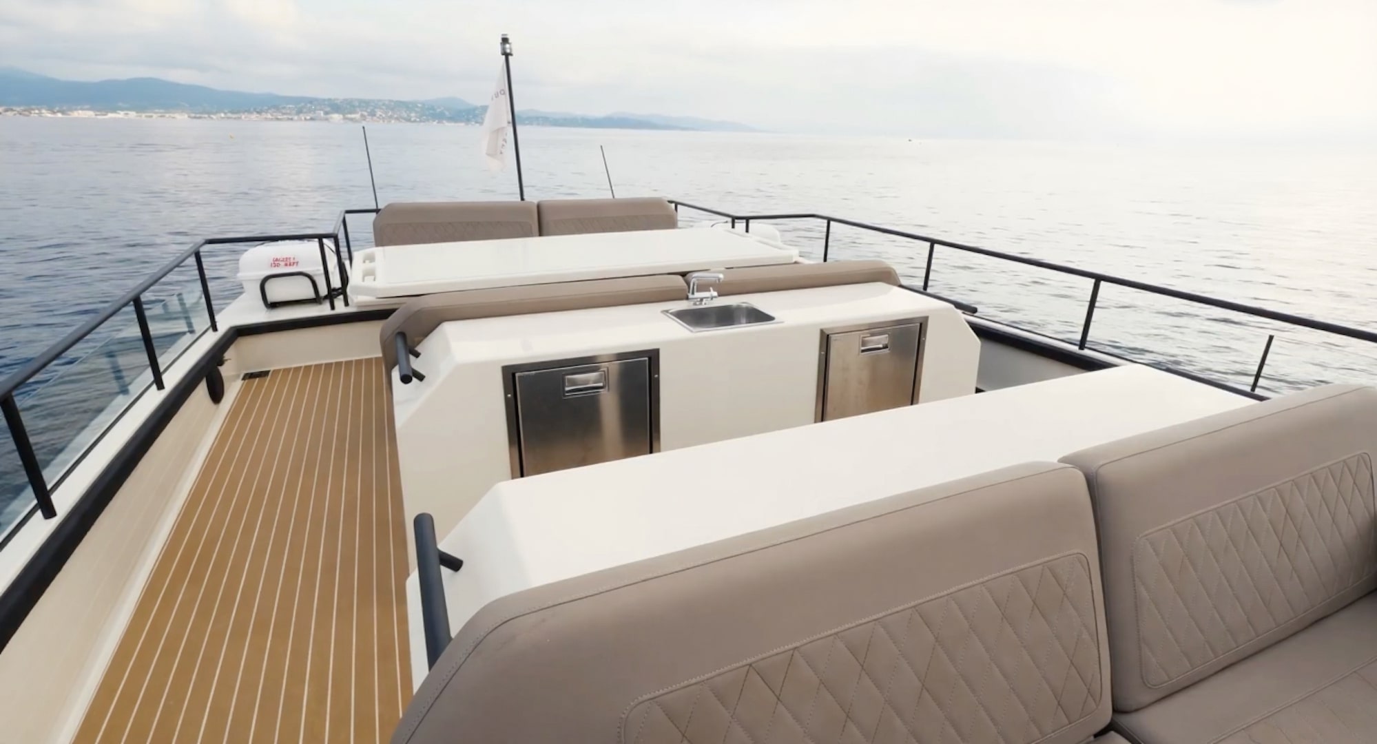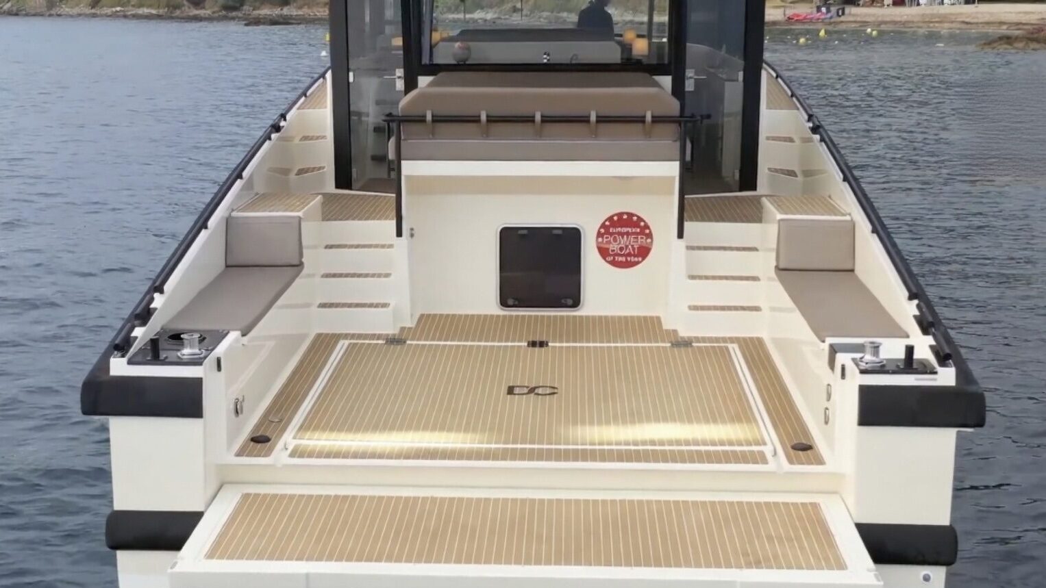 Practical and robust deck plan with synthetic teak, hardtop cockpit and broad walkarounds. Electric BBQ, Fusion audio, hydraulic platform and dual Delta anchors enhance functionality for cruising and swimming.
