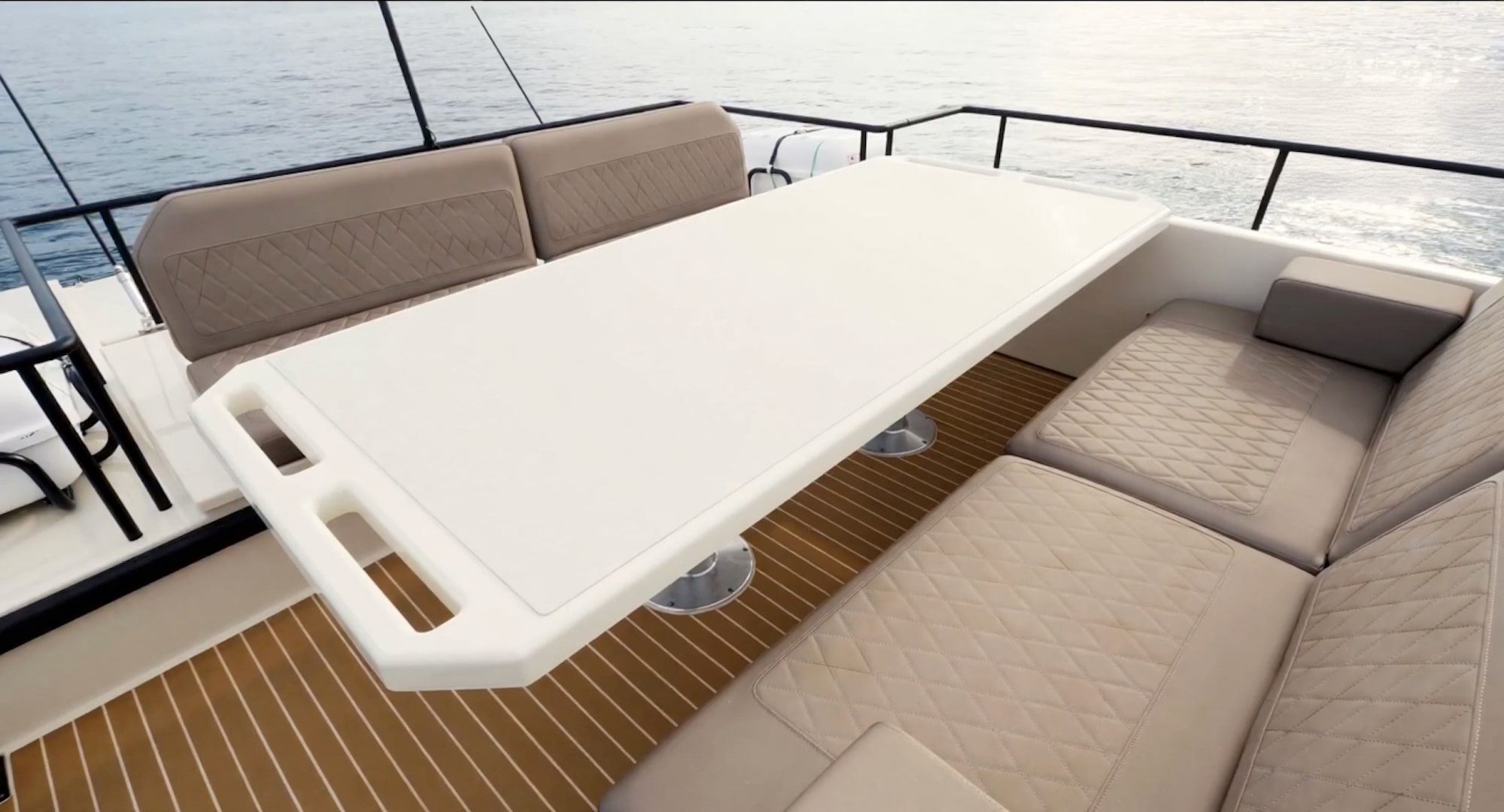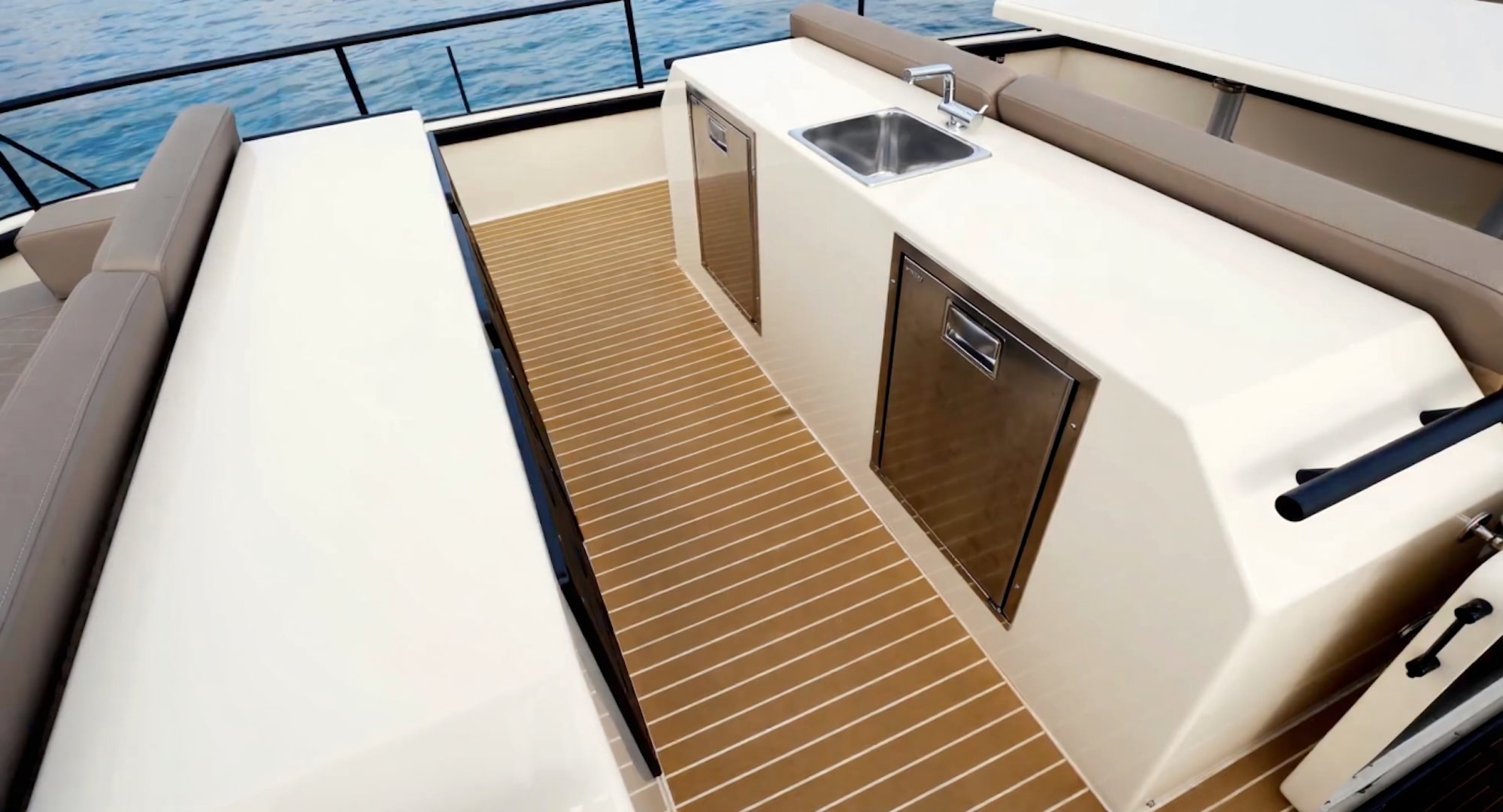 •Synthetic teak decking: cockpit, side decks, flybridge, swim platform