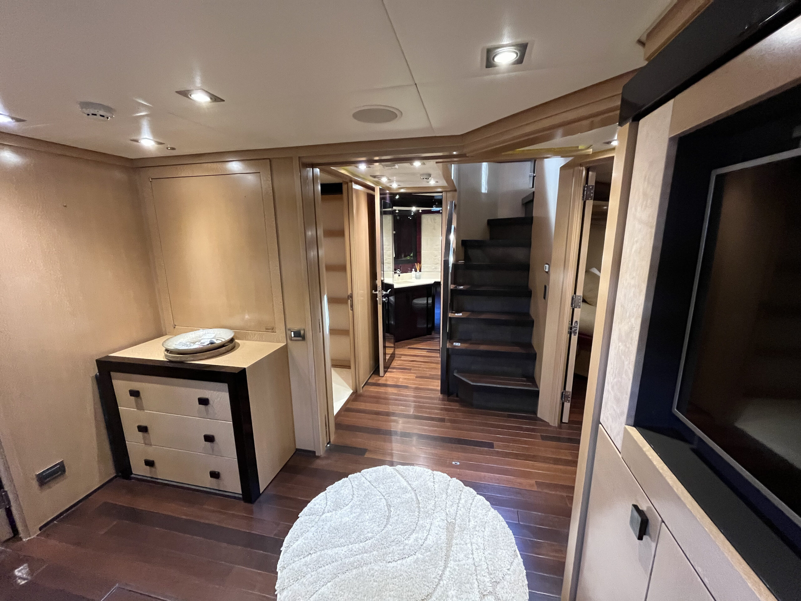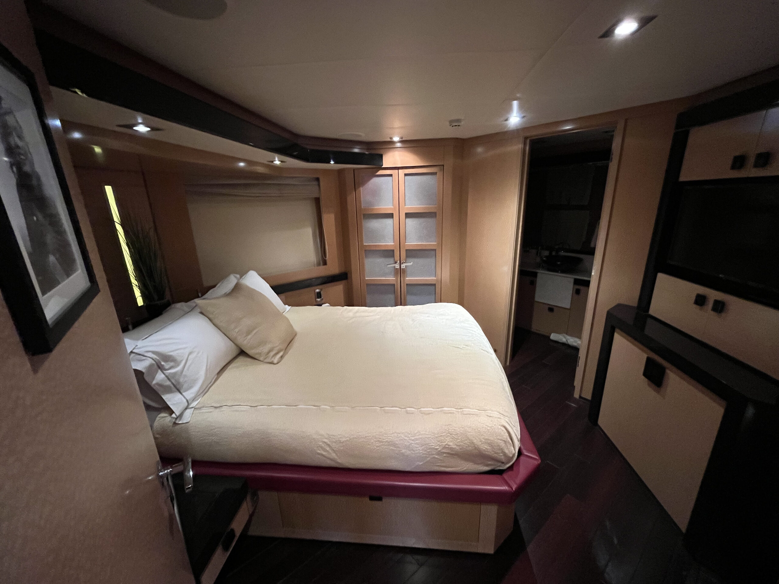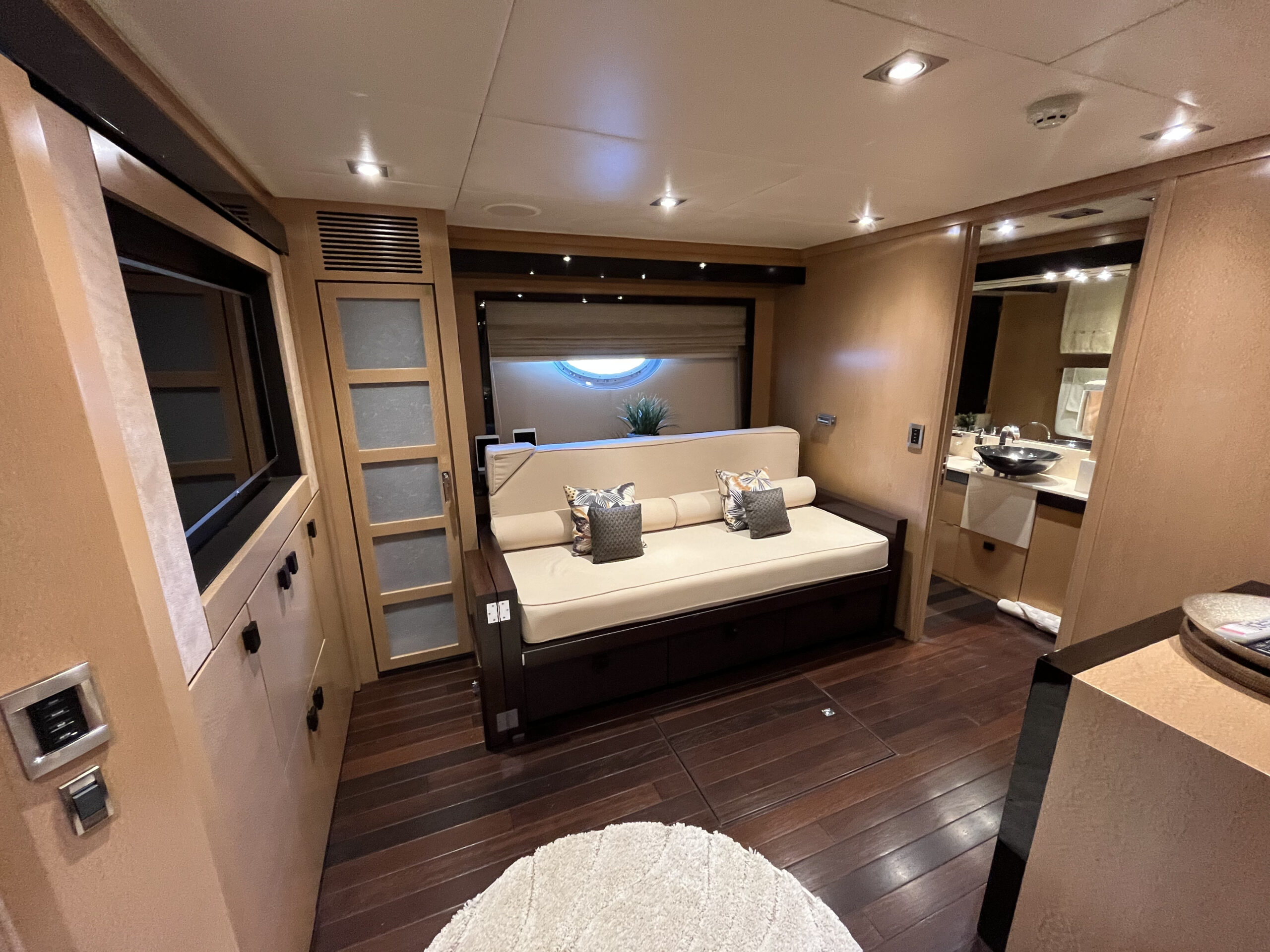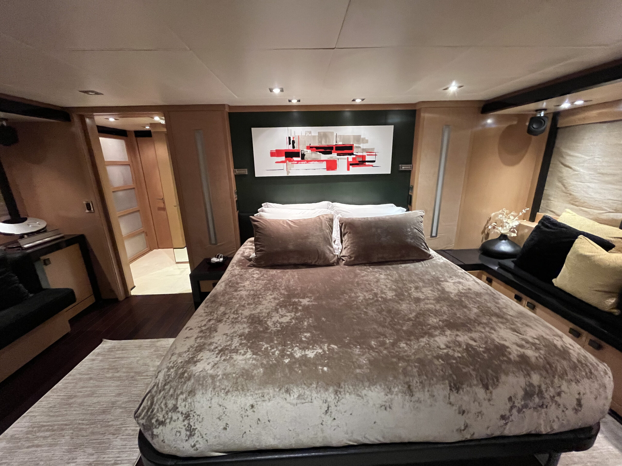IZUMI accommodates up to seven guests in four luxurious staterooms, including a full-beam master suite, two VIP cabins, and a convertible television lounge. Each cabin is equipped with en-suite facilities. The yacht’s expansive glass doors and windows flood the interior with natural light and frame spectacular views, ensuring comfort and beauty wherever your journey takes you.